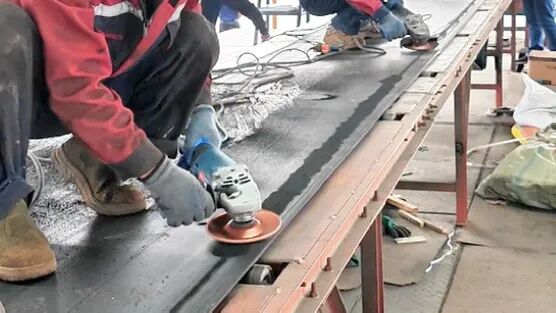 很多人修完输送带,没几天又破了,问题大概率出在打磨上!用角磨机对准输送带破损处进行打磨,(千万别磨穿输送带)露出干净粗糙的基底,这样后续胶水才能粘得更牢。