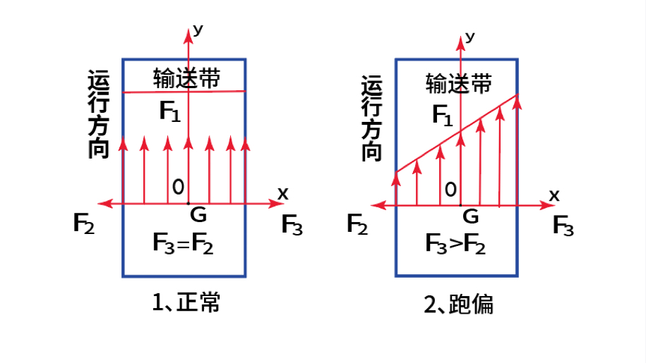 当输送带受到外力干扰,静摩擦力与运输方向会形成夹角,原本的受力平衡被打破,输送带就会向受力更大的一侧倾斜,最终导致跑偏。