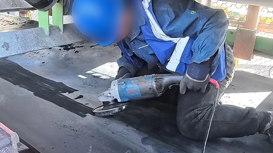 用角磨机将皮带破损面打磨粗糙,确保表面干净无残留(这是粘得牢的关键)